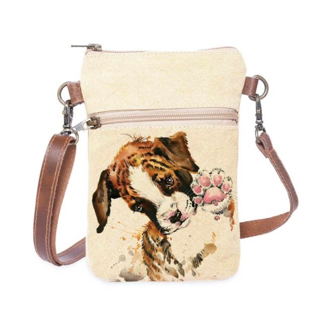 Carry your essentials with playful flair using our Doggo Cellphone Sling. Made with durable canvas and finished with genuine leather straps, this compact yet functional sling is designed for everyday convenience. Featuring a charming dog-themed print that brings a smile to your strolls, this bag is perfect for pet lovers who adore quirky style and hands-free ease.